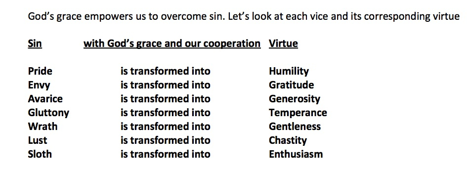 I was teaching a Morality class to adults last night and we were discussing the Seven Deadly (Captial) Sins and the Cardinal Virtues. We talked about how God never leaves us alone in sin – that God’s grace always overcomes sin. That’s why there is a corresponding virtue for each of the seven deadly sins.